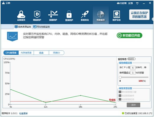 云鎖界面功能導航也沒啥特別的,界面大同小異,在平日涉及的網(wǎng)站、服務器安全需求也都囊括進去了,操作也符合傳統(tǒng)軟件的使用風格,簡易便捷。首頁呈現(xiàn)了服務器的各項狀態(tài),服務器信息一目了然。 2、網(wǎng)站、服務器各資源監(jiān)控、可設(shè)定異常預警線。 云鎖能夠?qū)崿F(xiàn)對網(wǎng)站性能數(shù)據(jù)的可控可觀,可對這些數(shù)據(jù)(并發(fā)連接數(shù)、吞吐量等)根據(jù)實際工作情況在云鎖里設(shè)定一個“危險警戒線”,當出現(xiàn)異常情況時會及時報警通知。 ![]()