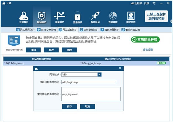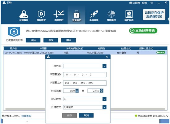 服務器性能監(jiān)控,系統(tǒng)資源(cpu使用率、內(nèi)存使用率、磁盤、網(wǎng)絡(luò) IO)監(jiān)控圖形化界面展現(xiàn),在圖形中可設(shè)定“危險警戒線”,當出現(xiàn)異常情況時,圖形界面一目了然。 ![]() 3、用戶管理賬號防護 云鎖可雙向保障賬號安全,一個是可以自定義后臺地址,相當于隱藏了網(wǎng)站后臺地址,防暴力猜測網(wǎng)站后臺;另一個是服務器賬號登錄防護,選擇服務器管理員賬號,可以限制登錄時間段、 IP及IP段,保障非工作時間賬號安全,防黑客入侵服務器。