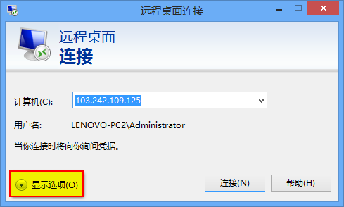 2、在”遠(yuǎn)程桌面連接”窗口右下角,點擊”顯示選項”。