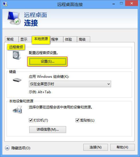 3、配置遠(yuǎn)程音頻設(shè)置。本地資源 – 遠(yuǎn)程音頻 – 設(shè)置。
