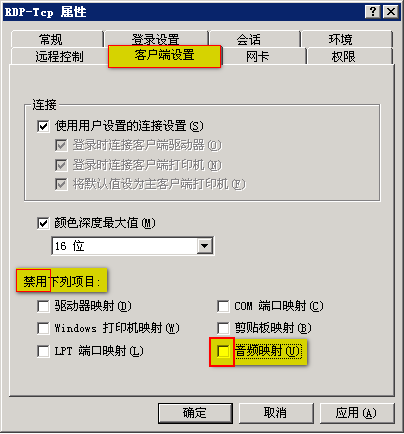 7、允許“音頻映射”。步驟:“客戶端設(shè)置”頁簽 - 禁用下列項目 – 去除“音頻映射” – 應(yīng)用 – 確定。