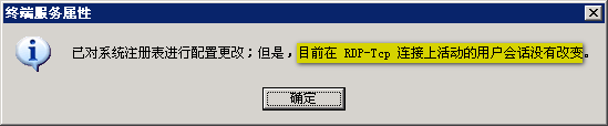 8、提示“已對系統(tǒng)注冊表進(jìn)行配置更改;但是,目前在RDP-Tcp連接上活動的用戶會話沒有改變”,所以,需要注銷登錄,重新再登錄一次。