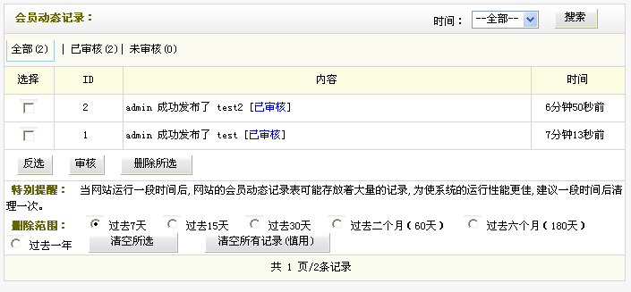 可以勾選指定ID的動態(tài)后,點擊“刪除所選”可以進行清理指定動態(tài)記錄;也可以點擊“審核”將所選動態(tài)審核通過。