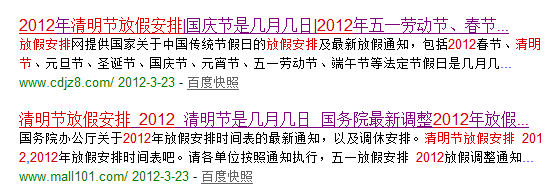 第四和第五是兩個(gè)獨(dú)立網(wǎng)站,所以出于筆者的愛好,點(diǎn)進(jìn)去看了下(因?yàn)榍迕鞴?jié)這種放假安排,一般都是大門戶內(nèi)頁或者政府網(wǎng)站公告占據(jù)前排,獨(dú)立網(wǎng)站排名這么好,肯定是有SEO操作的。)