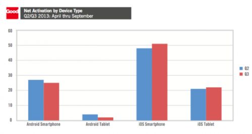 報告顯示在設備激活方面來看蘋果在第三季度的市場占比達到了72%,相比較第二季度的69%出現了增長。而Android設備則從第二季度的30%下降到27%,第一季度設備的占比為25%,出現增長的主要原因是三星推出了新產品。