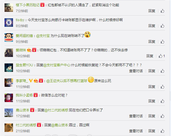 在支付寶官方微博的評(píng)論中,不少網(wǎng)友都表示目前支付寶的轉(zhuǎn)賬功能已經(jīng)無(wú)法使用了,在網(wǎng)絡(luò)連接正常的情況下,進(jìn)行轉(zhuǎn)賬等操作時(shí),會(huì)出現(xiàn)“系統(tǒng)錯(cuò)誤”、“網(wǎng)絡(luò)不給力”等字樣,導(dǎo)致操作失敗。不過(guò)紅包功能卻能正常使用。也有網(wǎng)友表示,他們的紅包功能也出現(xiàn)問(wèn)題,整個(gè)支付寶基本上處于癱瘓狀態(tài)。