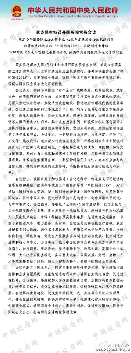 國務(wù)院總理李克強(qiáng)3月25日主持召開國務(wù)院常務(wù)會(huì)議,確定今年國務(wù)院立法工作重點(diǎn),讓改革發(fā)展沿著法治軌道前行;部署加快推進(jìn)實(shí)施“中國制造2025”,實(shí)現(xiàn)制造業(yè)升級(jí);聽取中國北車南車重組進(jìn)展情況匯報(bào),強(qiáng)調(diào)以國資國企改革優(yōu)化資源配置。