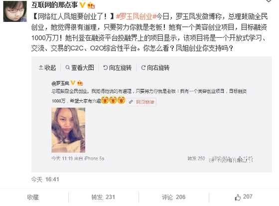 做生意70年代叫下海,10年后叫創(chuàng)業(yè)。2015年3月國務(wù)院總理李克強在政府工作報告中提出“互聯(lián)網(wǎng)+”戰(zhàn)略,一大波創(chuàng)業(yè)新軍在前在后紛紛崛起。4月20日,身在美國的網(wǎng)絡(luò)紅人羅玉鳳微博自曝,欲在投融界上融資千萬打造跨國美業(yè)O2O平臺。羅玉鳳想靠融資闖入炙手可熱的美業(yè)O2O,僅靠跨國平臺的噱頭夠不夠資格一戰(zhàn)?