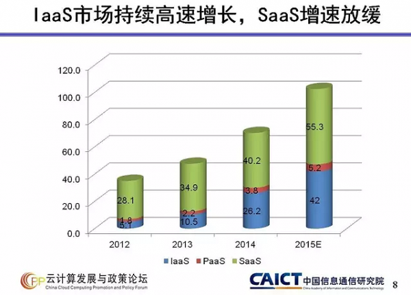云計算發(fā)展調查報告》。報告指出,2015年我國公共云服務總收入預計將達到102.5億元,同比增長46%;IaaS市場總收入預計將達42億元,同比增長逾60%,增勢迅猛。