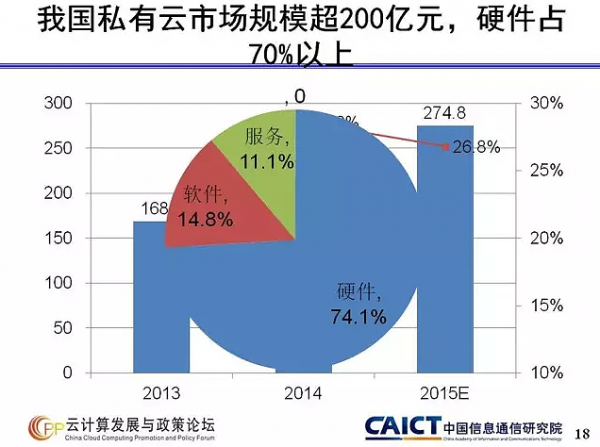 報告顯示,預計2015年我國私有云市場規(guī)模將達274.8億元,同比增長26.8%,其中硬件占70%以上。大部分用戶表示,可控性強、安全性好是他們選擇私有云的首要原因,部分用戶還考慮到保護原有投資和方便遷移等因素。企業(yè)管理系統(tǒng)是私有云用戶選擇承載在云端的熱門應用,有72.03%的用戶選擇了此項,此外,應用開發(fā)與大數(shù)據(jù)分析、辦公系統(tǒng)以及核心業(yè)務系統(tǒng)也是私有云上的主流應用。