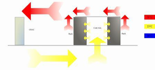 服務器機柜前方,經機柜網孔門被服務器設備吸入,熱風被機柜排出后自然回風或通道吊頂、風道回風至空調上方的回風口,完成一次制冷循環。