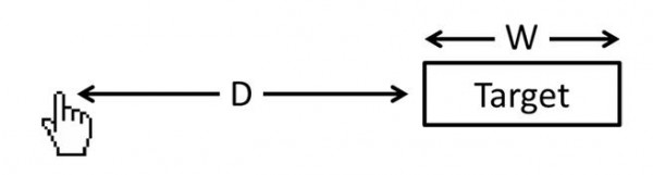 定律內容:從一個起始位置移動到一個最終目標所需的時間由兩個參數來決定,到目標的距離和目標的大小(上圖中的 D與 W),用數學公式表達為時間 T = a + b log2(D/W+1)。