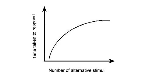定律內容:一個人面臨的選擇(n)越多,所需要作出決定的時間(T)就越長。用數學公式表達為反應時間 T=a+b log2(n)。在人機交互中界面中選項越多,意味著用戶做出決定的時間越長。例如比起 2 個菜單,每個菜單有 5 項,用戶會更快得從有 10 項的 1 個菜單中做出選擇。