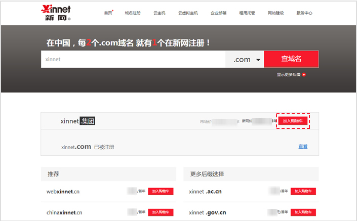 第二步:在【域名查詢結(jié)果頁(yè)】,將該域名【加入購(gòu)物車】