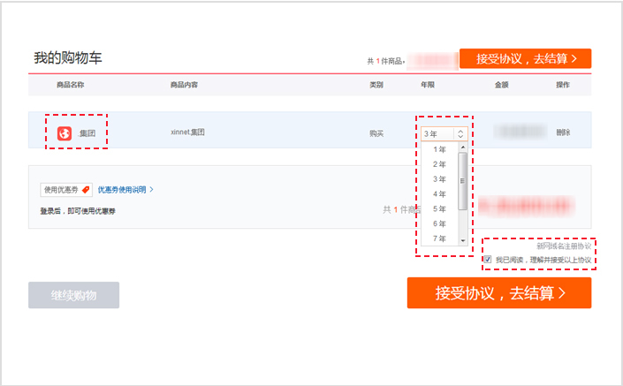 第四步:進(jìn)入【購(gòu)物車】,確認(rèn)域名內(nèi)容是否正確,選擇【注冊(cè)年限】,閱讀【新網(wǎng)域名注冊(cè)協(xié)議】