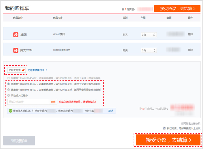 第五步:點(diǎn)擊【使用優(yōu)惠券】,選擇已有的優(yōu)惠券或手動(dòng)輸入優(yōu)惠券,確定后,點(diǎn)擊【接受協(xié)議,去結(jié)算】