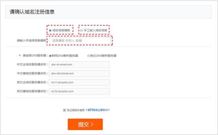 第六步:填寫(xiě)域名信息模板已有域名信息模板的,選擇【域名信息模板】,輸入關(guān)鍵字(信息模板名稱、所有人、郵箱)查找模板;沒(méi)有域名信息模板的,選擇【手工輸入域名信息】,填寫(xiě)模板信息