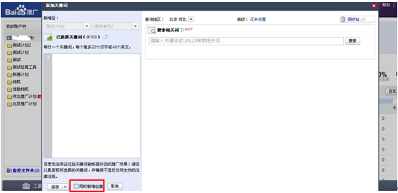 您可以自己直接輸入關(guān)鍵詞,也可以采用系統(tǒng)自動推薦的優(yōu)質(zhì)關(guān)鍵詞。保存之前,可選擇匹配模式,若勾選“同時(shí)新增創(chuàng)意”,可直接撰寫創(chuàng)意。