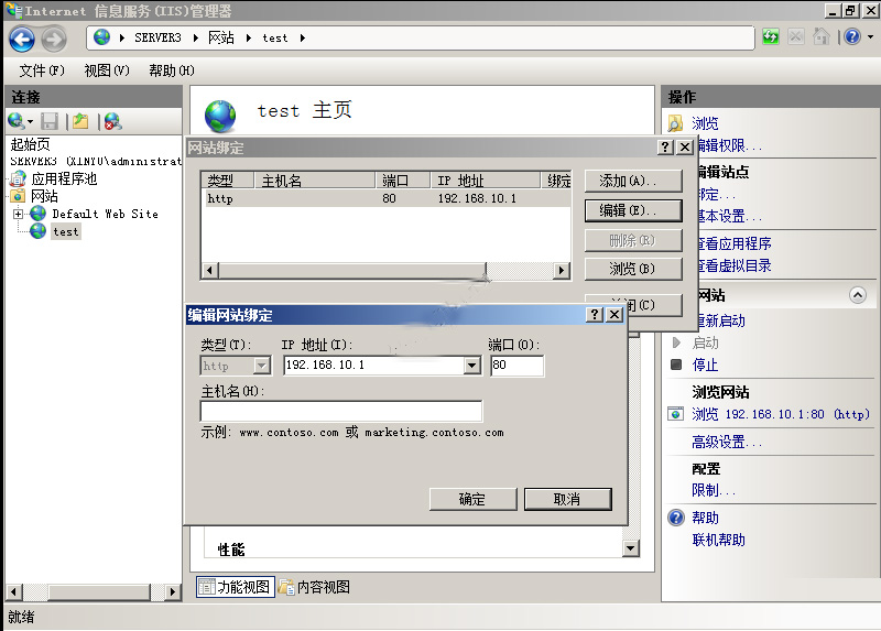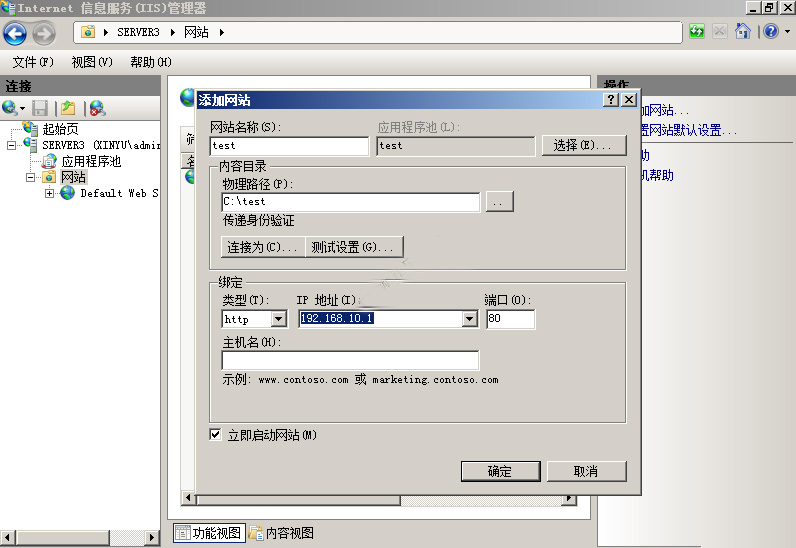 右健,添加網站,在這里,網站名稱我輸入:test,物理路徑選擇你網站的路徑,演示網站放在C盤下的test文件夾;