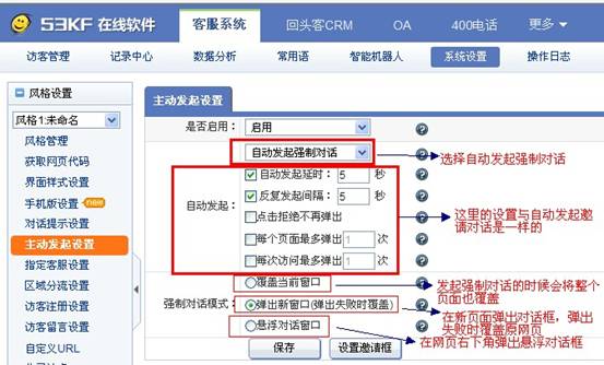 53kf強(qiáng)制對話是一個了不起的功能。當(dāng)訪客打開網(wǎng)站,系統(tǒng)直接彈出對話框和客戶建立對話鏈接,基本上有意向的客戶,都會選擇直接使用對話框咨詢,效果非常好,很多婚紗攝影用戶都在開啟使用。在選擇自動發(fā)強(qiáng)制對話后,選項(xiàng)設(shè)置和自動發(fā)起設(shè)置是一樣,只是增加了選擇強(qiáng)制對話兩種模式,是新窗口打開,還是懸浮對話窗口。