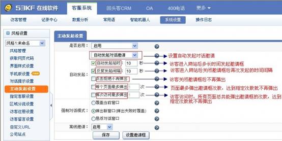 系統(tǒng)默認(rèn)主動發(fā)起次數(shù)為一次,如果害怕訪客誤操作關(guān)閉,則可以設(shè)置反復(fù)發(fā)起對話邀請。此時,可以設(shè)置各種彈出邀請框的參數(shù),如:重復(fù)發(fā)起的時間間隔、每個頁面最多彈出邀請框的次數(shù)等等。當(dāng)勾選了反復(fù)發(fā)起間隔30秒,則在訪客離開前,系統(tǒng)將每隔30秒主動反復(fù)發(fā)起邀請對話。