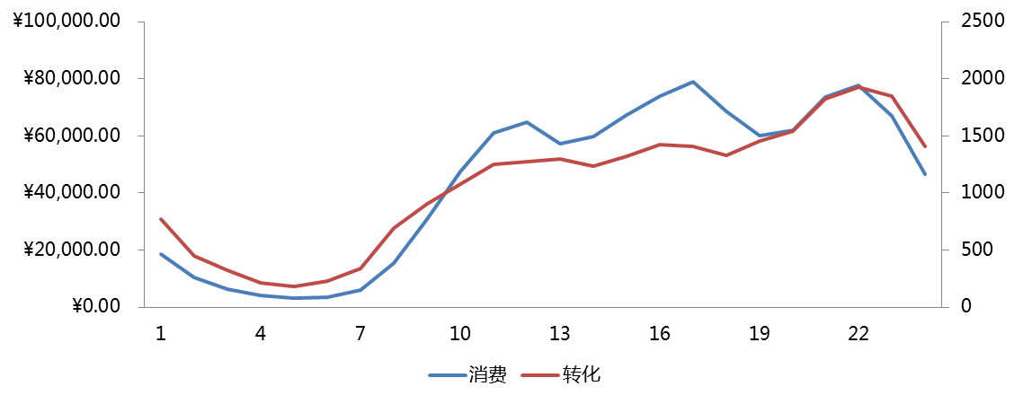 在筆者一位客戶的推廣過程中,筆者通過對不同時段的消費、轉化進行了分析,發現在不同時段中,不同的渠道,網民的行為和流量占比差別是比較大的,這樣的發現也為我們在推廣時間的優化上提供了幫助,如圖1-2、圖1-3。