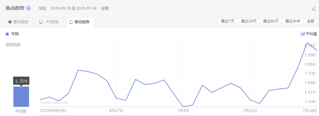 選定關鍵詞后,我們可以通過指數的趨勢來查看該關鍵詞具體的搜索趨勢以及PC端、WAP端所表現出來的不同的特點,以“車險”關鍵詞為例。