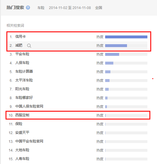 從圖1-4的百度指數需求圖譜中,我們不難發現,與車險相關的檢索詞TOP10中,排名前2位的詞是“信用卡”、“減肥”;第10位則是“西服定制”,而非帶有車險的關鍵詞。對此,我們可以初步斷定,關注車險的網民群體中,極大一部分的人還關注信用卡(金融)、減肥(健康養生)、西服定制(服飾)等內容。