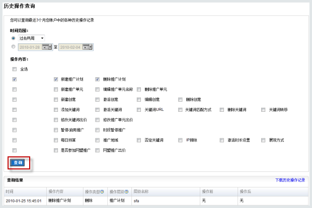 歷史操作查詢工具可幫助您查看自己對賬戶進行操作的歷史記錄,以此判斷哪些操作可能影響您的推廣效果,對調整做出決策。
