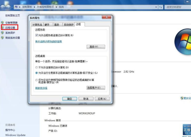 2、在打開(kāi)的系統(tǒng)窗口右側(cè)點(diǎn)擊“遠(yuǎn)程設(shè)置”按鈕,勾選“允許遠(yuǎn)程協(xié)助連接這臺(tái)計(jì)算機(jī)”,接著在下面選擇“運(yùn)行運(yùn)行任意版本遠(yuǎn)程桌面的計(jì)算機(jī)連接”,點(diǎn)擊確定進(jìn)入下一步。如下圖:
