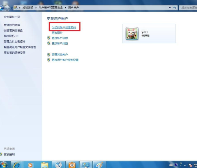 4、進(jìn)入”用戶賬戶“選項(xiàng)后,點(diǎn)擊”為您的賬戶創(chuàng)建密碼“選項(xiàng),進(jìn)入下一步。如下圖: