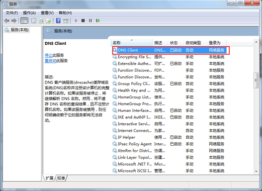 6、在打開的“服務”窗口中,找到“DNS Client”服務,若此服務沒有開啟,我們“啟動”此服務即可,同樣建議大家啟動“DHCP Client”服務。