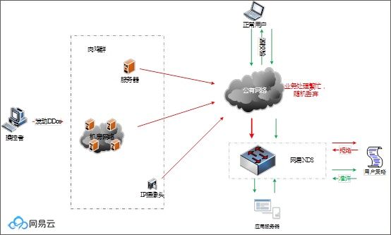 從服務的角度來說DDoS防護本質上是一場以用戶為主體依賴抗D防護系統與黑客進行較量的戰爭,在整個數據對抗的過程中服務提供者往往具有絕對的主動權,用戶可以基于抗D系統特定的規則,如:流量類型、請求頻率、數據包特征、正常業務之間的延時間隔等。基于這些規則用戶可以在滿足正常服務本身的前提下更好地對抗七層類的DDoS,并減少服務端的資源開銷。詳細示意圖如下: