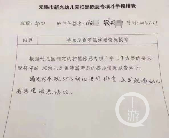 上游新聞記者看到,這張《排查表》顯示排查時間為5月27日,排查對象是無錫市新光幼兒園中四班的35名幼兒。《排查表》中對排查原因描述為:根據幼兒園制定的掃黑除惡專項斗爭工作方案要求,現將中四班幼兒是否涉黑涉惡的摸排情況報告如下。回復是:“通過對本班35名幼兒進行排查,未發現有幼兒有涉黑涉惡情況。”表格抬頭,附有兩名班主任老師的簽名。