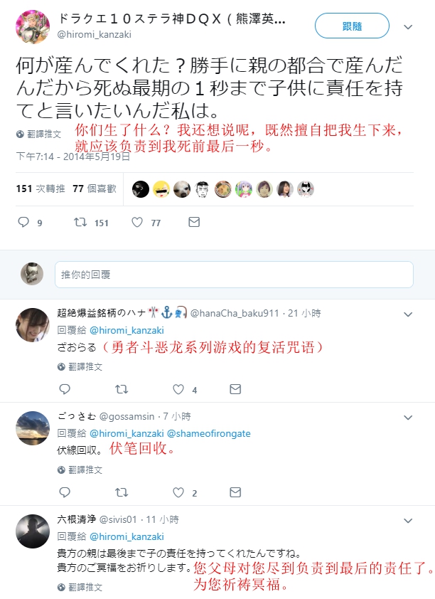 在網友貼出的該賬號過往言論中,還有一些則顯示推主疑似與父母關系不和。其中一條發表于2014年,內容是:“既然擅自把我生下來,就應該負責到我死前最后一秒。”