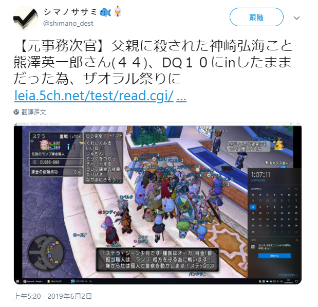 日本網友綜合該賬號的信息,推測其就是熊澤英一郎的賬號,甚至在他死前登陸著的游戲中為其虛擬角色舉行了復活儀式,有網友將游戲截圖也貼了出來:
