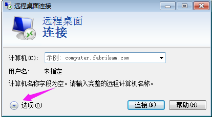 第三步:在彈出的“遠(yuǎn)程桌面連接”對(duì)話框中單擊下拉“選項(xiàng)”按鈕;