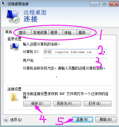 第四步:在伸展的“遠(yuǎn)程桌面連接”的“常規(guī)”按鈕中依次輸入——計(jì)算機(jī)(填寫你購(gòu)買VM時(shí)系統(tǒng)給你郵箱發(fā)送的IP地址,其中還包括用戶名和密碼) 》 用戶名 》 保存 ,在連接之前,你也可以根據(jù)個(gè)人需要更改顯示、本地資源、程序、體驗(yàn)、高級(jí)按鈕等選項(xiàng),最后點(diǎn)擊“連接”按鈕;
